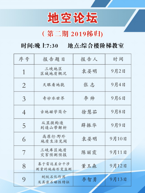 9月2日,各带班老师开始进行基本知识理论和技能讲授。同学们在老师的带领下,分别参观岩石园、标本室、学习罗盘使用方法、野簿记录格式等等。另外,地空学院在秭归产学研基地开展的论坛活动受学生和老师的好评,已经开展两年,今年将继续开展论坛活动,涉及地质学、地质灾害学、遥感地质学和野外生存等丰富内容。