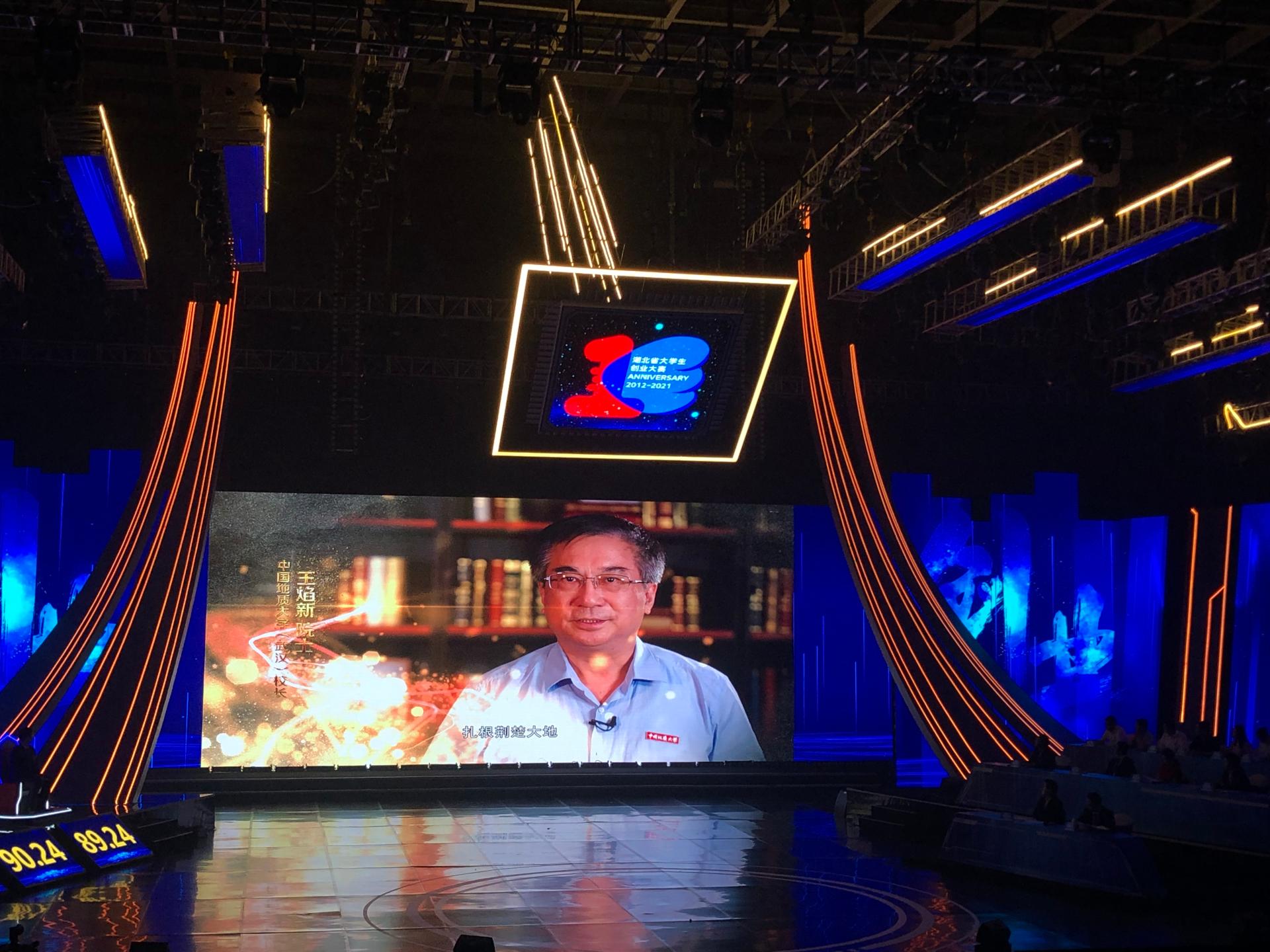 武汉市市长程用文为四强选手、“创业之星”获得者、我院在读博士生王中鹏颁奖。校长王焰新院士通过现场视频为创业大学生发来寄语,希望广大大学生扎根荆楚大地,锤炼创的精神、创的劲头。