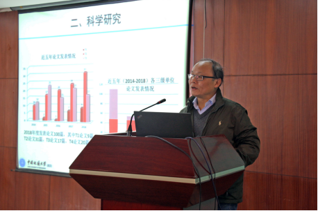 熊熊院长作学院2018年度工作报告,介绍了学院总体发展趋势,分析在学科评估以及学科建设中学院取得的成绩和面临的压力与挑战,并汇报学院2018年度财务收入和支出情况。