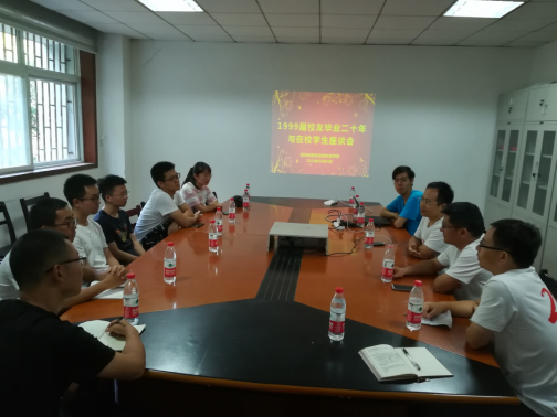 在物探楼214会议室召开毕业30周年返校聚会校友与学生座谈会,孙卫斌、张宗胜、潘新志、王宝明、黎益仕、秦建强、严建文、王殿学等8位校友与20余位在校学生进行了座谈交流。