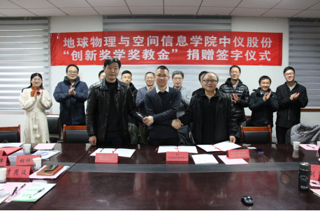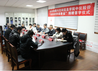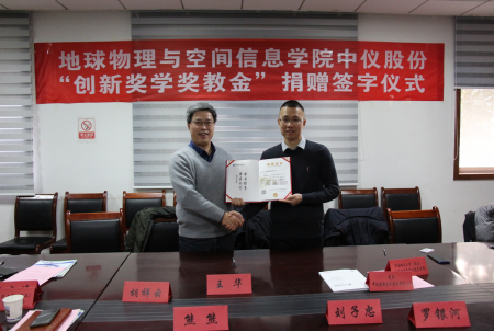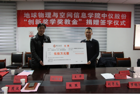 中仪股份“创新奖学奖教金”捐赠仪式在物探楼214会议室举行。武汉中仪物联技术股份有限公司董事长郑洪标、总经理助理张婉珈,副校长王华,学校教育发展基金会副秘书长吕占峰,91传媒