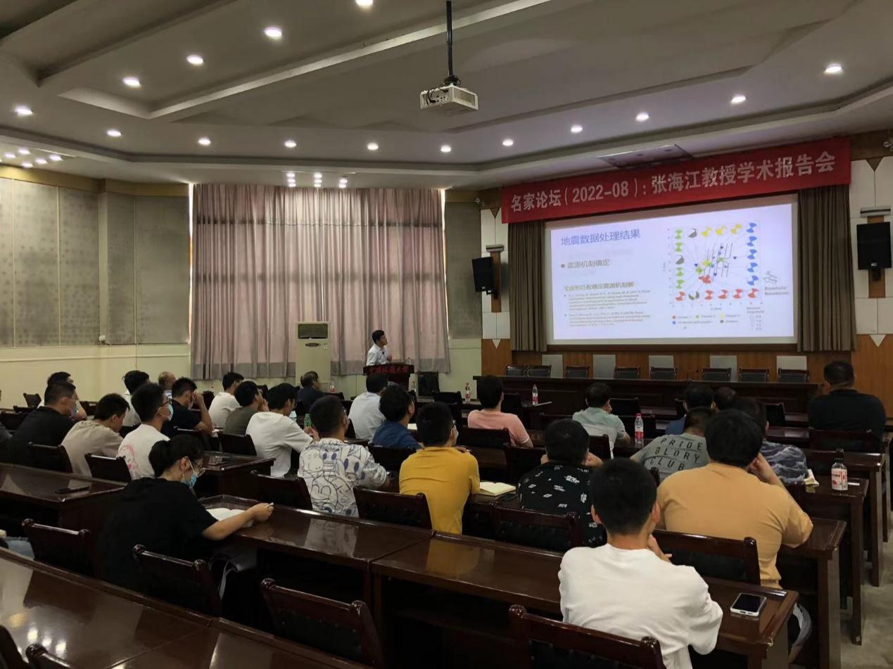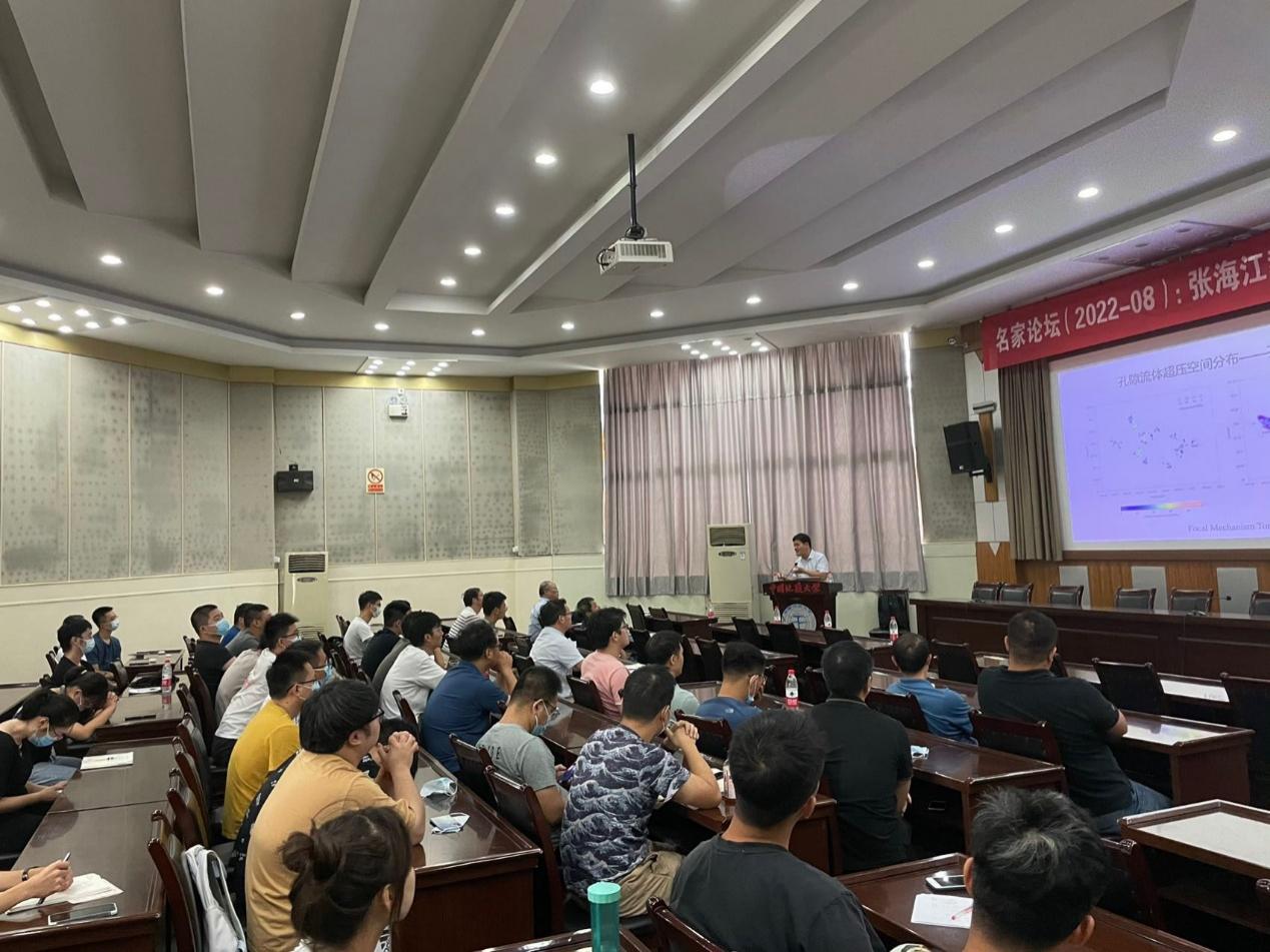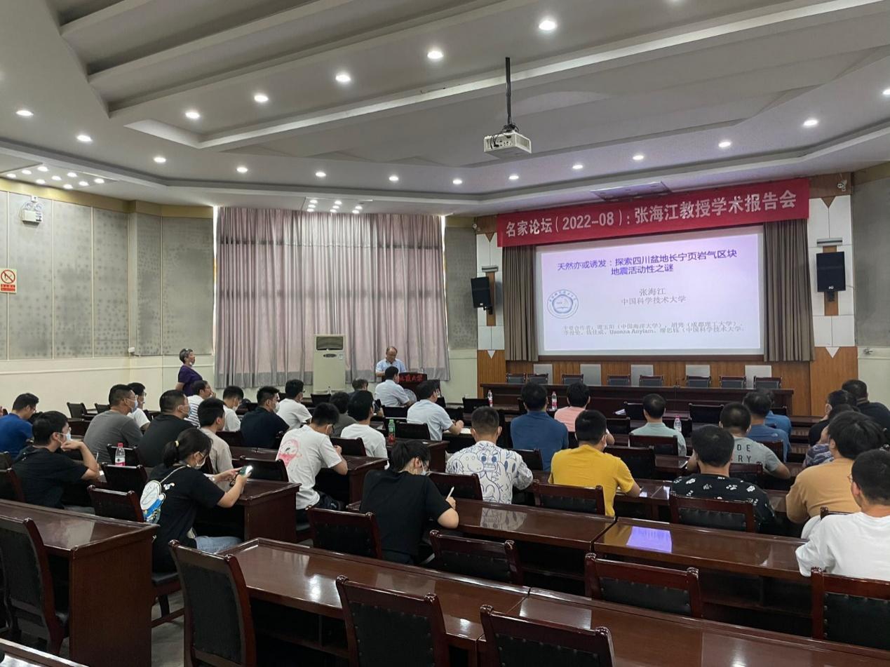 熊熊教授邀请,中国科学技术大学张海江教授来校访问并在八角楼学术报告厅做了“天然亦或诱发:探索四川盆地长宁页岩气区块地震活动性之谜”的学术报告,全校60多位师生到场聆听讲座。