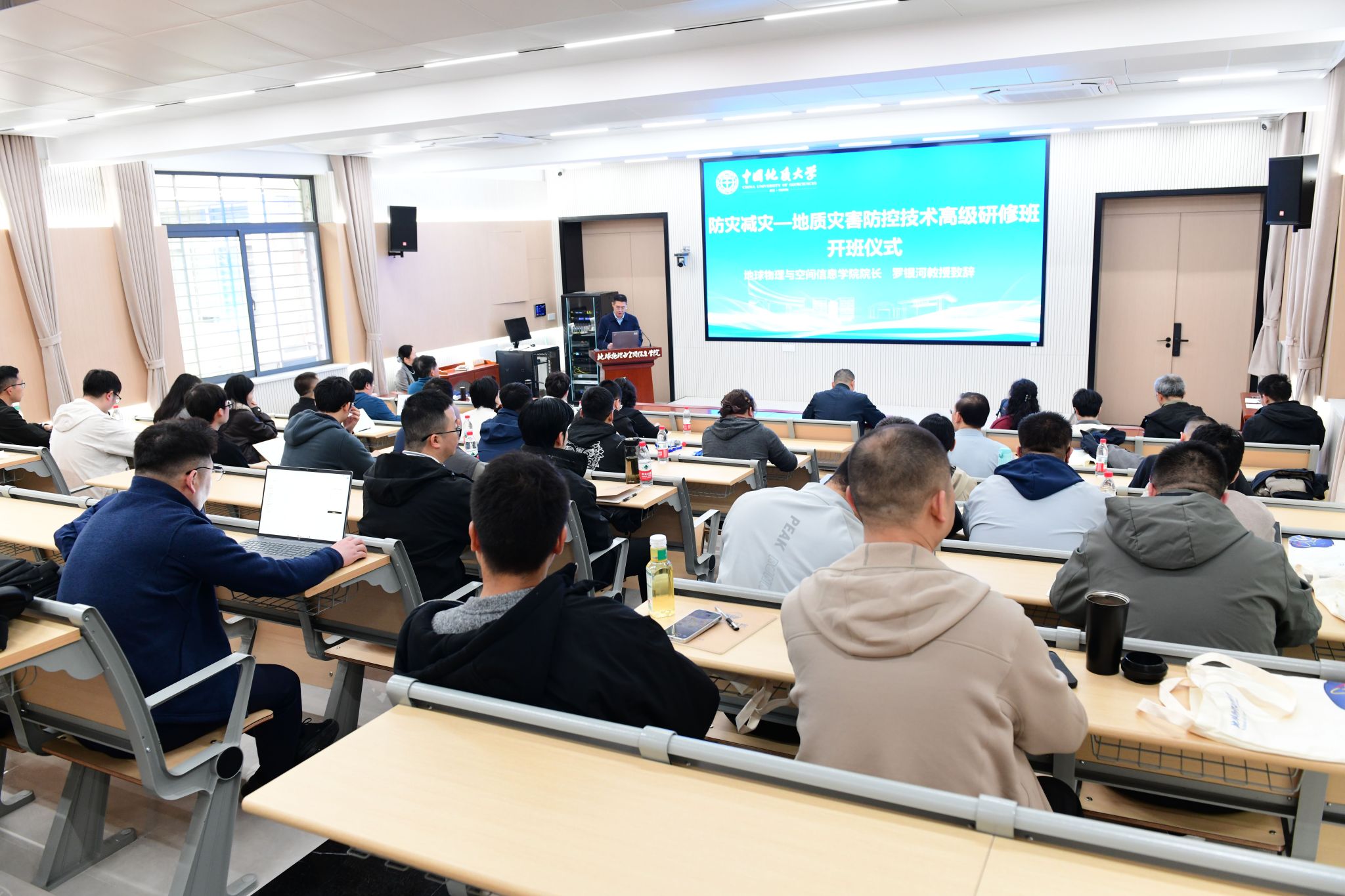 院长罗银河致辞,对研修班学员们的到来表示欢迎,并简要介绍了学院的基本情况、学科特色和育人优势。他希望授课教师坚持问题导向,创新教学方法,提高授课针对性,着力解决一线难题,互学共进、教学相长。学院与各单位在培训中深入交流、增进合作,推动校企产学研用深度融合,主动服务地质灾害防控工作,共同谱写地质事业新篇章。