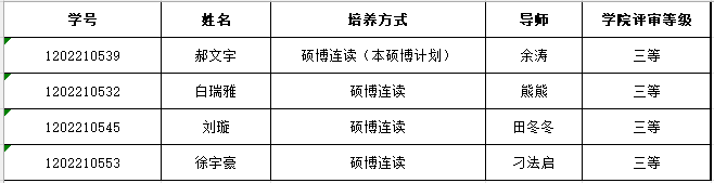 10月24日研究生院公布了《2022年硕博连读研究生选拔结果公告》,我院4名2022级硕士研究生被批准为我校2022年硕博连读研究生,符合博士生学业助学金参评资格,经个人申请、材料审核及学院评审,现将推荐名单进行公示: