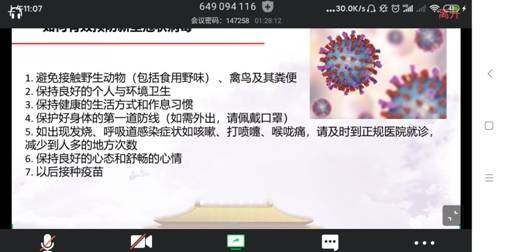 为深入推进“坚定信心、主动作为、共同抗‘疫’”主题教育,提高学生党员的政治素养与党性原则,根据中共中央《关于加强党的领导、为打赢疫情防控阻击战提供坚强政治保障的通知》和中共湖北省纪委机关、省委组织部有关文件要求,2020年2月27日,在地探专业硕士研究生纵向党支部书记郭楚枫同志的组织下,中国地质大学(武汉)地空学院地探专业硕士研究生纵向党支部开展“众志成城,抗击疫情,武汉必胜”学习活动,邀请优秀党员志愿者刘汉生同志直播疫情下的武汉小区;学习贯彻习近平在统筹推进新冠状肺炎疫情防控和经济社会发展工作部署会议上的重要讲话精神;介绍新冠状肺炎,探讨了作为一名党员面对疫情应尽的职责;最后介绍了一些常见的病毒,以及“糖丸爷爷”顾方舟研究疫苗的故事。